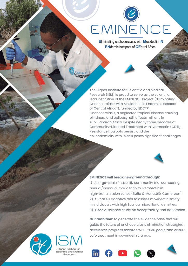 The Higher Institute for Scientific and Medical Research (ISM) is proud to serve as the scientific lead institution for the EMINENCE Project (Eliminating Onchocerciasis with Moxidectin in Endemic Hotspots of Central Africa), funded by EDCTP.